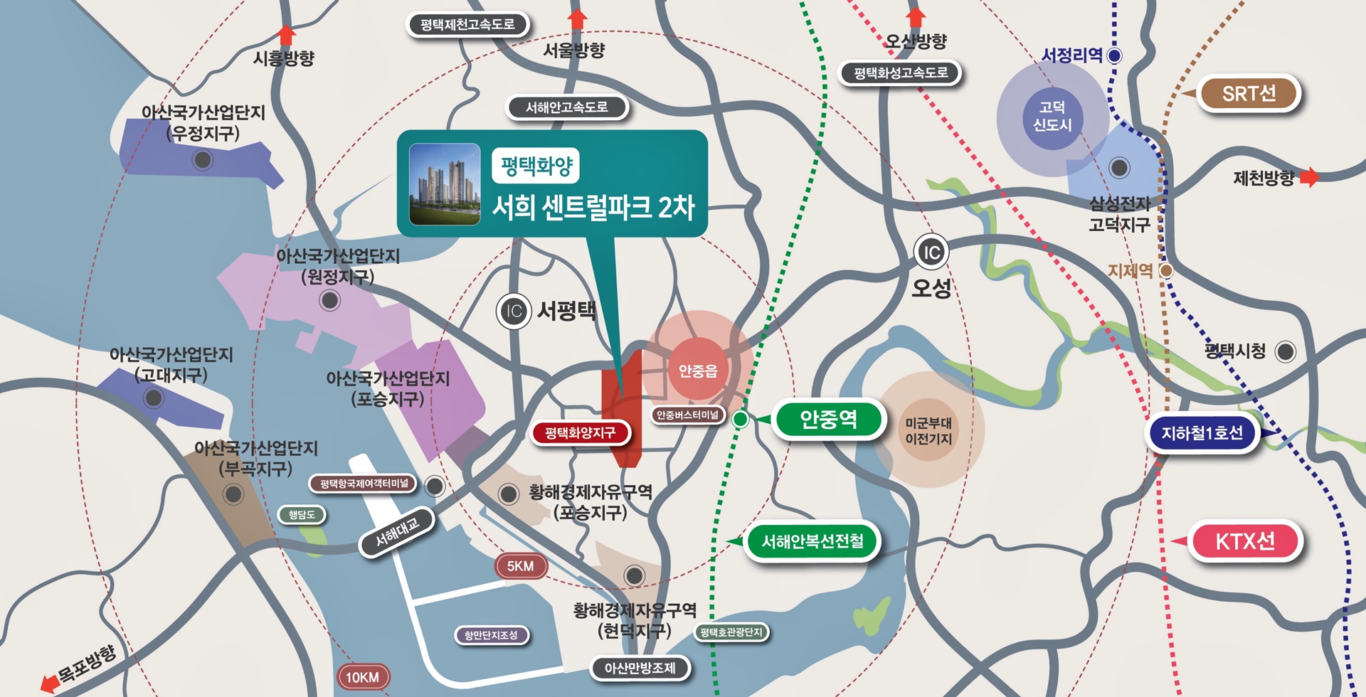 안중역(KTX직결,서해선, 평택선) 서해안고속도로,평택제천간고속도로,제2서해안고속도로,38번국도 인접 서평택IC,포승IC,차량이동 10분 내 거리에 위치하여 고속도로 접근성 우수
